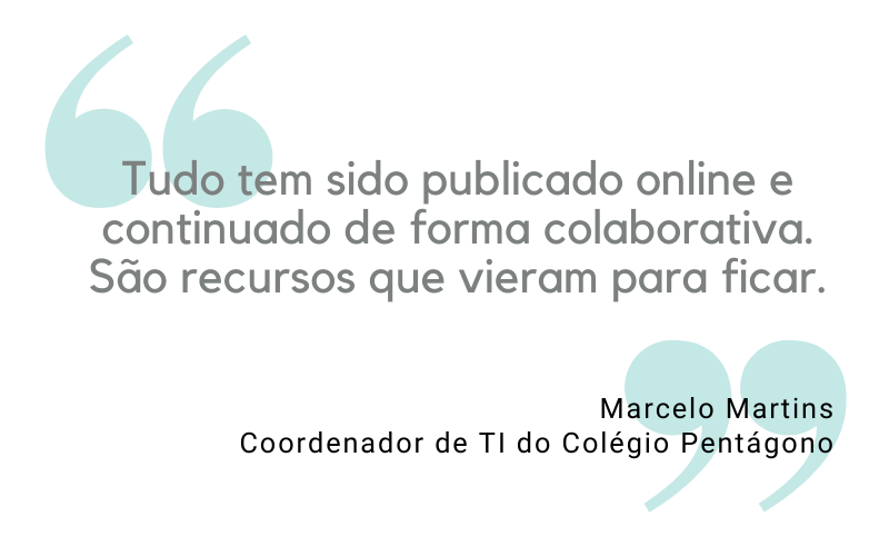 Para o coordenador Marcelo Martins, a quarentena forçou a aceleração digital das empresas. E a comunidade escolar do Pentágono também foi convencida de que esse era o melhor caminho a seguir. “Tudo tem sido publicado online e continuado de forma colaborativa. São recursos que vieram para ficar”, afirma.
