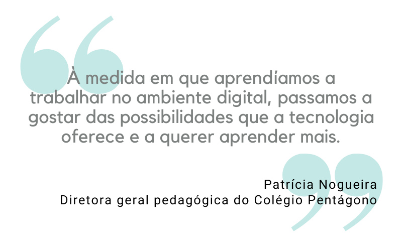 Patrícia Nogueira concorda que os desafios impostos pela quarentena não assustaram a equipe pedagógica do Pentágono. “O que percebemos é uma vontade enorme de acertar. Qualquer resistência que havia em relação à tecnologia não existe mais”, diz. “Todos tiveram que aprender. E à medida em que aprendíamos a trabalhar no ambiente digital, passamos a gostar das possibilidades que a tecnologia oferece e a querer aprender mais”.