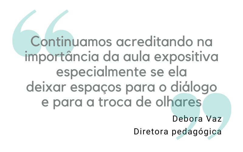 “Não queremos substituir ou simular um horário único o tempo todo, um momento real e imediato de aula”, explica a diretora pedagógica. “Continuamos, por exemplo, acreditando na importância da aula expositiva especialmente se ela deixar espaços para o diálogo, a troca de olhares, os estranhamentos, as contribuições dos alunos.”