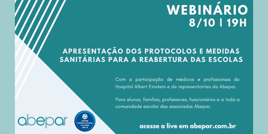 A Associação Brasileira de Escolas Particulares e Sociedade Beneficente Israelita Brasileira Albert Einstein apresentam a alunos, famílias, professores, funcionários e a toda a comunidade escolar os protocolos e as medidas sanitárias adotadas pelas escolas para garantir um retorno seguro e gradual às atividades presenciais. O webinário, com a presença de médicos e profissionais do Hospital Albert Einstein e de representantes da Abepar, está agendado para a próxima quinta-feira, dia 8 de outubro, às 19 horas.