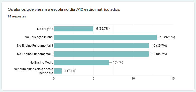 5) Houve a presença de alunos em todos os níveis. A maioria deles está matriculado na Educação Infantil (92,9%). Muitos estudantes do Ensino Fundamental 1 e 2 também participaram do retorno (85,7%).