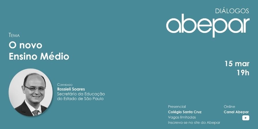 Rossieli Soares, secretário da Educação do Estado de São Paulo, é o convidado do próximo “Diálogos Abepar”, ciclo de encontros e palestras promovido pela Associação Brasileira de Escolas Particulares. Rossieli Soares vai falar do novo Ensino Médio e dos desafios de sua implantação na rede estadual. O encontro será realizado no dia 15 de março, às 19h, nas dependências do Colégio Santa Cruz, associado da Abepar, e terá transmissão ao vivo pelo Canal Abepar no YouTube.