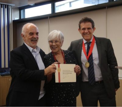 Mauro de Salles Aguiar recebeu seu diploma de Membro Honorário das mãos de Guiomar Namo de Mello, ex-secretária da Educação do munício de São Paulo, e de Hubert Alquéres, ex-secretário da Educação do Estado de São Paulo (foto).