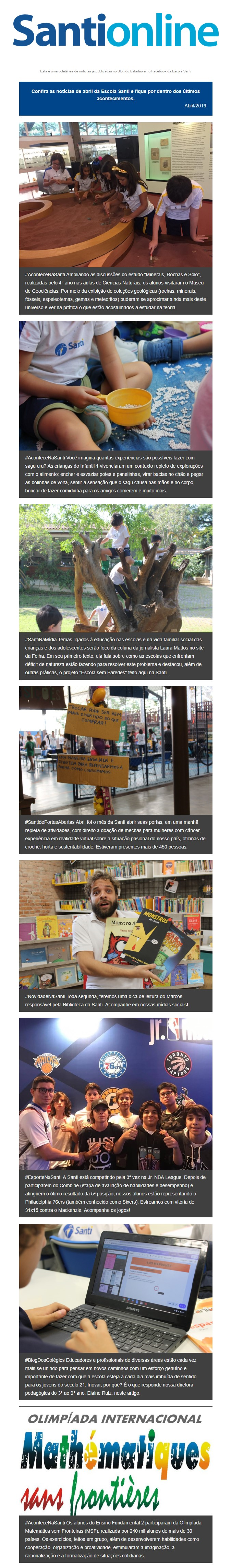 A Escola Santi divulga a Santi Online, revista eletrônica que traz as últimas notícias da escola. Veja a edição mais recente aqui.