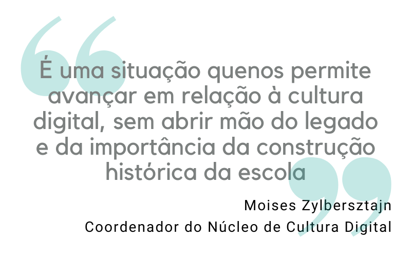 Moises Zylbersztajn, coordenador do Núcleo de Cultura Digital do Santa, acrescenta: “às vezes nem é uma videoconferência, é um fórum em que o professor cria e fica de plantão naquele período para conversar com os alunos”.