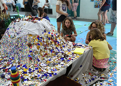 O envolvimento das crianças pôde ser notado na apresentação de seus trabalhos, reunidos em espaços temáticos que propunham um conjunto de garatujas, colagens, esculturas, instalações, imagens e outras produções organizadas por frestas e janelas, cores vermelha e verde, água, luz, transparência e, até mesmo, mistério!